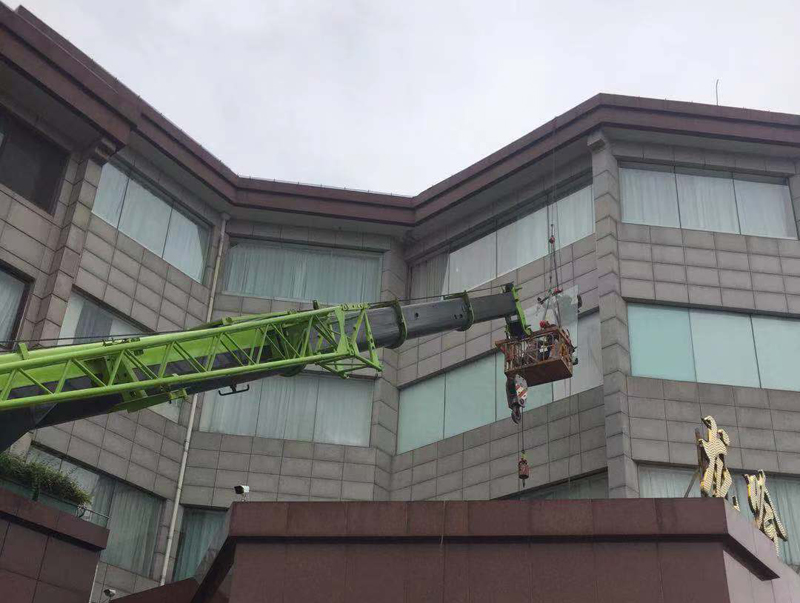 上海悅華大酒店幕墻玻璃更換施工現場照。